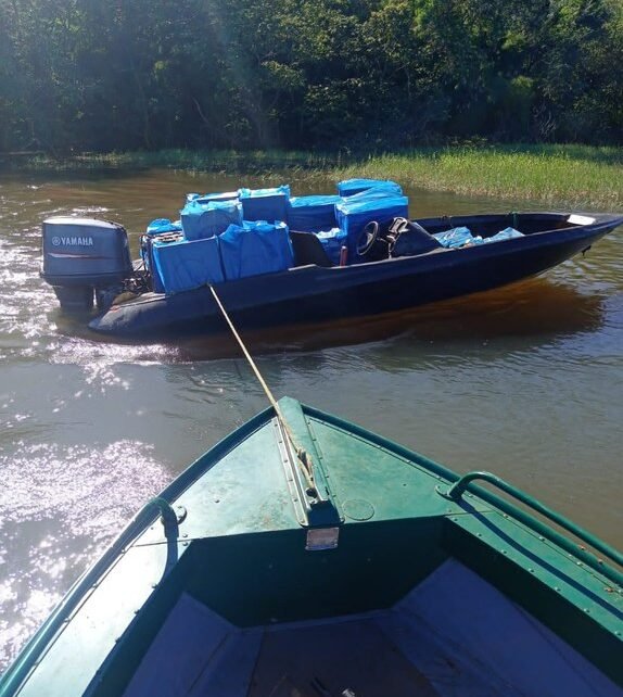Policiais apreenderam a embarcação e o motor, além de 40 caixas de cigarros estrangeiros vindos do Paraguai.