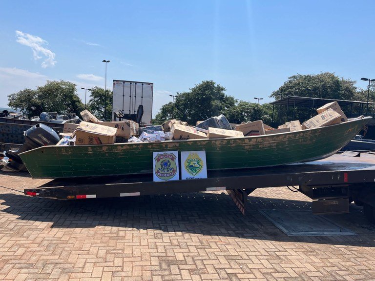 Na segunda-feira (18/09), policiais federais do NEPOM, em ação integrada com policiais militares do BPFRON, realizavam patrulhamento aquático no lago na cidade de Mercedes-PR, quando avistaram uma embarcação. Com a aproximação policial os indivíduos que estavam no barco abandonaram a embarcação, fugiram pela mata e não foram encontrados. No local foi apreendida uma embarcação carregada com 1.250 pacotes de cigarros contrabandeados e 600 kg de inseticidas contrabandeados.