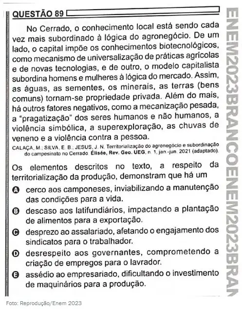 Dentre as 90 questões deste domingo uma delas se destacou pela seu claro ataque ao modelo de Agricultura aplicado pelo agronegócio brasileiro. A questão 89 da prova branca tem gerado muito debate nas redes sociais neste domingo (05).