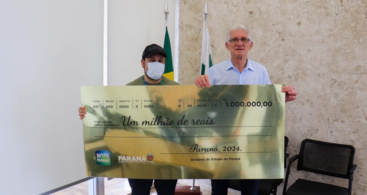 Ganhador de R$ 1 milhão no sorteio com o maior número de participantes da história do Nota Paraná, o parnanguara J.O. decidiu se manter como mais um na multidão até mesmo na hora de receber o prêmio máximo do programa. De boné e máscara para evitar ser reconhecido, ele recebeu o cheque simbólico do secretário estadual da Fazenda, Norberto Ortigara, nesta terça-feira (10), ao lado da família.
