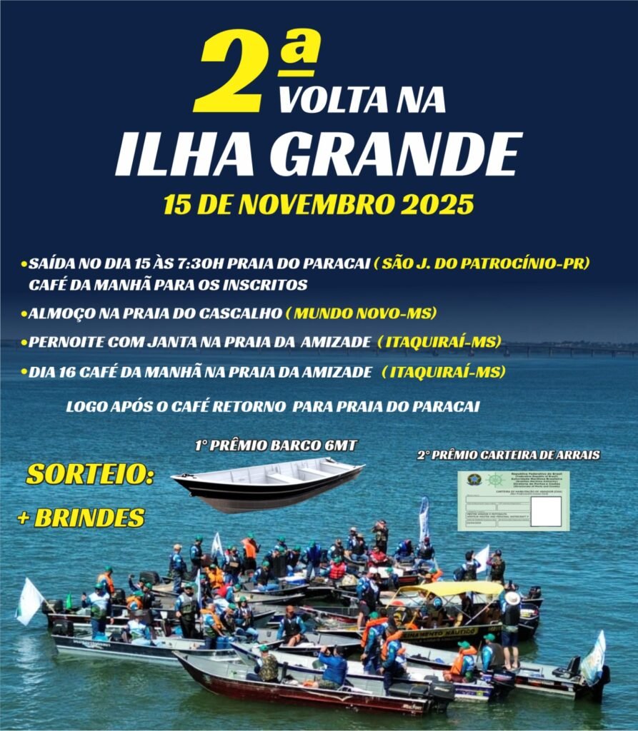 No dia 15 de novembro acontecerá a segunda edição da volta na Ilha Grande, e nessa edição terá o sorteio de uma barco zero e de vários brindes aos participantes, incluindo café da manhã, almoço e jantar.