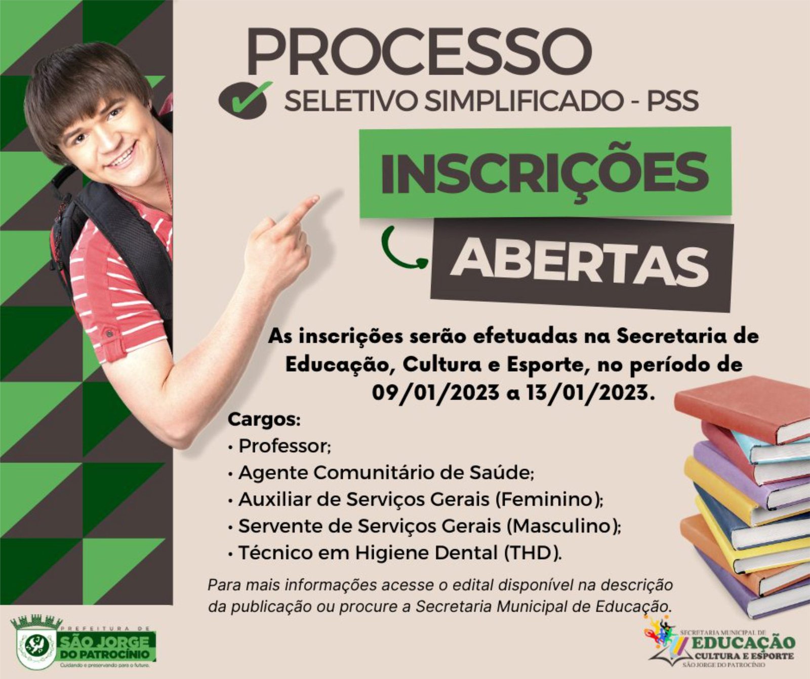 PROCESSO SELETIVO SIMPLIFICADO – PSS 2023 INSCRIÇÕES ABERTAS – As inscrições serão efetuadas na Secretaria de Educação, Cultura e Esporte no período de 09/01/2023 a 13/01/2023.